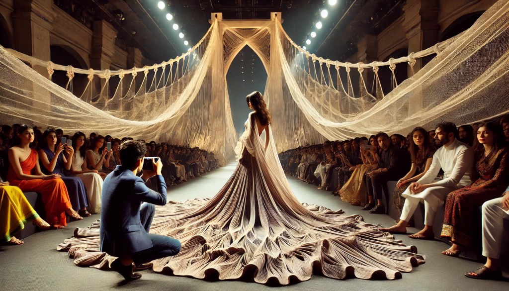 Meher’s design took center stage—a stunning avant-garde piece inspired by the railway bridge. The model walked with poise, the dress flowing like layers of suspended fabric, mimicking the cables of a suspension bridge. Metallic threads shimmered under the spotlight, capturing the essence of strength and fragility. It was a bridge, not just of fabric, but of ideas—of art merging with reality.